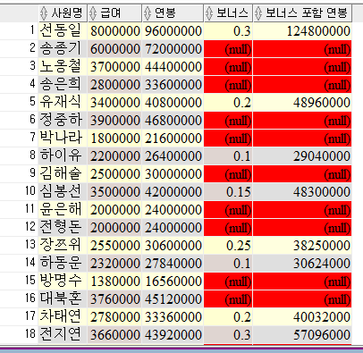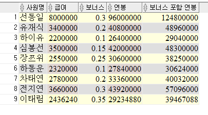 SALARY AS 급여, BONUS AS 보너스,
