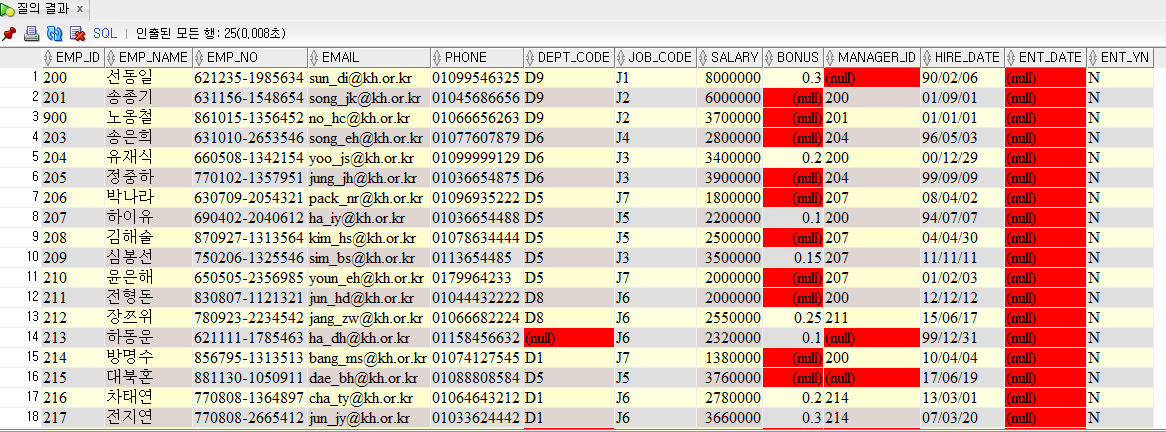 추가로 위의 결과들 중에 NULL 값들이 표시되고 있는 것 결과들이 있다. 이렇게 NULL이 포함되지 않은 데이터를 조회하고 싶을 때는 NULL 관련 비교 연산자를 사용할 수 있다.