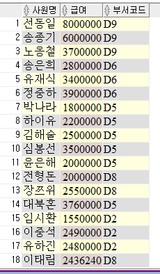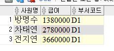 SELECT EMP_NAME AS "사원명", SALARY AS "급여", DEPT_CODE AS "부서코드"